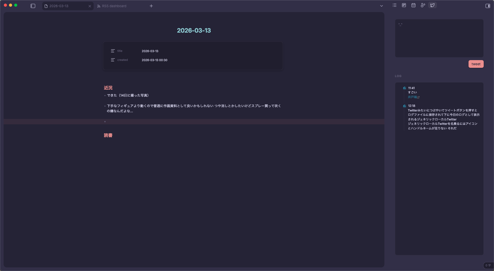 自分だけで使うobsidianのプラグインを細々開発している。といってもほぼAIに書いてもらっているんだけど…まあそれでも割と良いメモ機能になったのではないか。もうちょいTwitter(Xとは呼ばない)に寄せるか迷うが、それならそういうプラグインをもう使ったほうがいい気もする。